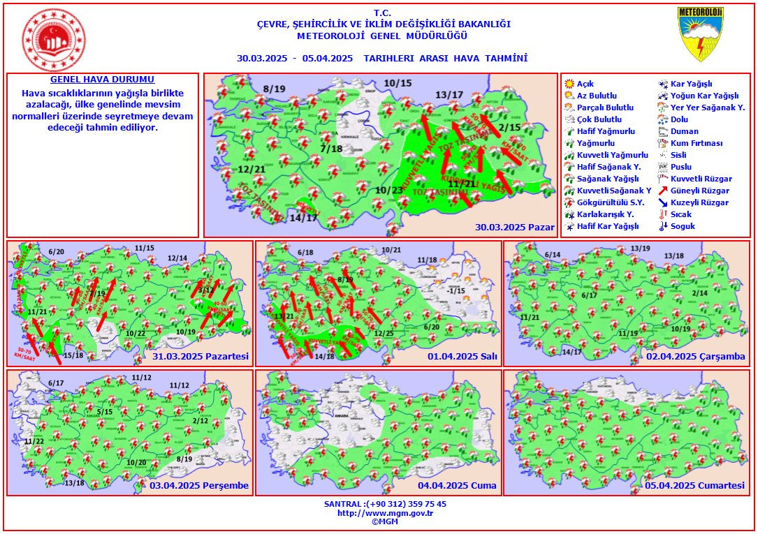 Hava sıcaklığının yağışla birlikte 2 ila 6 derece azalacağı tahmin edilirken ülke genelinde mevsim normallerinin üzerinde seyretmeye devam edecek. Yağışların Doğu ve Güneydoğu Anadolu’nun batısı, Sivas, Kayseri’nin doğu çevreleri, Osmaniye, Kahramanmaraş, Adıyaman, Kilis, Gaziantep ve Antalya’nın doğu kesimleri ile akşam saatlerinden itibaren Diyarbakır, Mardin, Batman, Siirt, Şırnak, Bingöl, Hakkari ve gece saatlerinde Adana çevrelerinde yer yer kuvvetli olması bekleniyor. Ülkemizin güneybatı ve doğu kesimlerinde toz taşınımı bekleniyor.