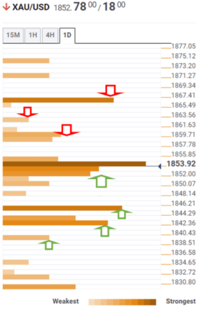 Piyasa analisti Dhwani Mehta, tahmin edildiği gibi altın fiyatının, piyasa hissiyatında ani bir geri dönüş üzerine düşmeden önce 1.878 dolar direnç bölgesini test ettiğini belirtiyor. Analistin kullandığı Technic Confluences Detector, altın fiyatındaki düşüşün şu ana kadar 1.852-1.850 dolar bölgesi civarında sınırlandığını gösteriyor. Analist bu bölgenin, önceki ayın en yüksek seviyesi olan Fibonacci %23,6’nın bir günlük ve bir haftalık yakınsaması olduğunu hatırlatıyor ve şu seviyelere dikkat çekiyor: