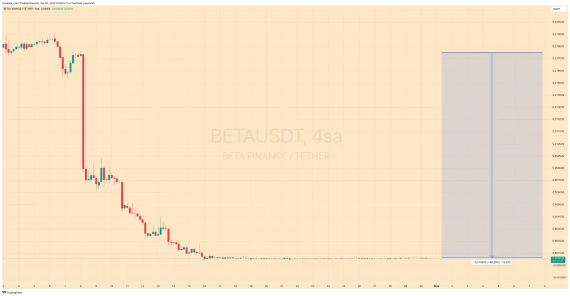 Binance tarafından 8 Nisan 2025 tarihli yapılan duyuruda delist edeceği duyurulan Badger Finance (BETA) söz konusu tarihten beri yüzde 97 değer kaybetmiş durumda.