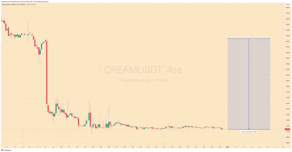 Merkeziyetsiz finans (DeFi) protokolü Cream Finance’ın kripto parası CREAM, Binance’in delist duyurusundan sonra yüzde 75 düştü.