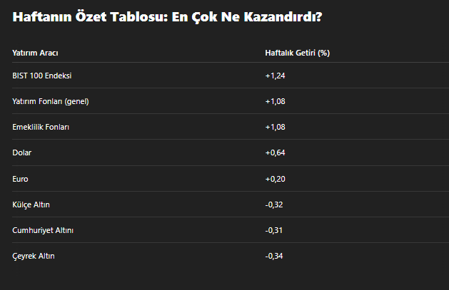 Yatırımcılar için bu hafta, hisse senetleri ve fonlara yönelenlerin kazandığı bir dönem oldu. Altında ise sınırlı bir geri çekilme yaşanırken, döviz cephesinde Dolar öne çıktı. 18-25 Nisan haftasında yatırımcıların yüzünü en çok Borsa İstanbul güldürdü. BIST 100 endeksi yüzde 1,24 artışla haftayı 9.432,55 puandan kapattı. Dövizde dolar yüzde 0,64, euro ise yüzde 0,20 oranında yükselirken, altın cephesinde hafif bir geri çekilme yaşandı. Külçe altın, Cumhuriyet ve çeyrek altın sırasıyla yüzde 0,32, 0,31 ve 0,34 oranında değer kaybetti. Yatırım ve emeklilik fonları ise yatırımcısına yüzde 1,08 getiri sağladı. Bu grupta en çok kazandıran yüzde 1,76 ile karma ve değişken fonlar oldu.