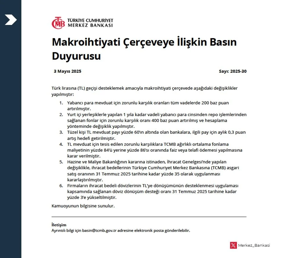 TCMB, Türk lirasını güçlendirmek ve rezervleri artırmak için yeni makroihtiyati tedbirler aldı. Döviz mevduatlarına zorunlu karşılıklar yükseltilirken, ihracatçılara döviz bozdurma zorunluluğu uzatıldı ve bankalara TL mevduatlarını artırmaları yönünde baskı yapıldı. Uzmanlar ise bu adımların yapısal sorunları çözmekte yetersiz kaldığını vurguladı.
