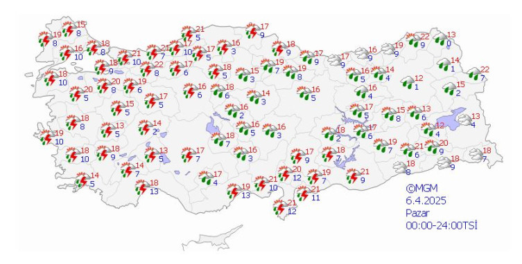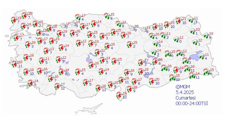 Meteoroloji Genel Müdürlüğü, 4 Nisan Perşembe gününde ülke genelinde parçalı ve çok bulutlu bir havanın etkili olacağını açıkladı. Yapılan tahminlere göre, özellikle Güney ve İç Ege, Akdeniz, İç Anadolu, Karadeniz’in iç kesimleri, Doğu Anadolu’nun batısı ve Güneydoğu Anadolu sağanak yağış alacak. Ayrıca Edirne, Kırklareli, Tekirdağ, Bartın, Ordu, Erzurum, Muş, Bitlis ve Şırnak çevrelerinde de aralıklı sağanak ve gök gürültülü sağanak yağışlar bekleniyor.