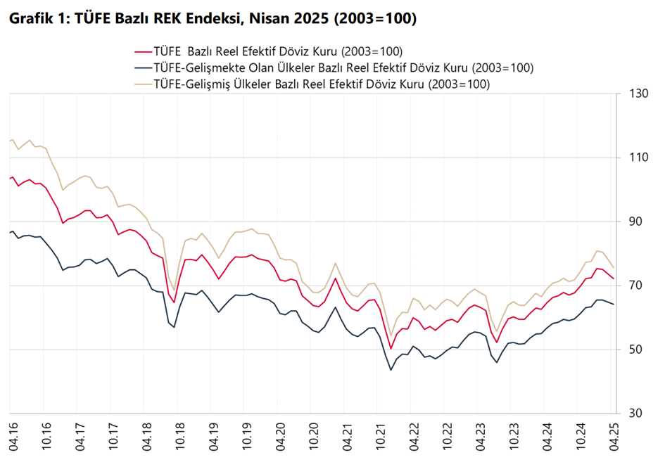 Reel efektif döviz kuru; bir ülkenin para biriminin, dış ticaret yaptığı ülkelerin para birimlerine göre enflasyon farkları dikkate alınarak hesaplanan değeridir. Bu endeksin düşmesi, TL’nin reel olarak değer kaybettiği ve dolayısıyla Türkiye’nin dış ticarette daha rekabetçi hale geldiği anlamına gelebilir. Ancak uzun vadede düşük reel kur; enflasyon, yatırımcı güveni ve dış borç gibi başlıklarda çeşitli riskler de doğurabilir.